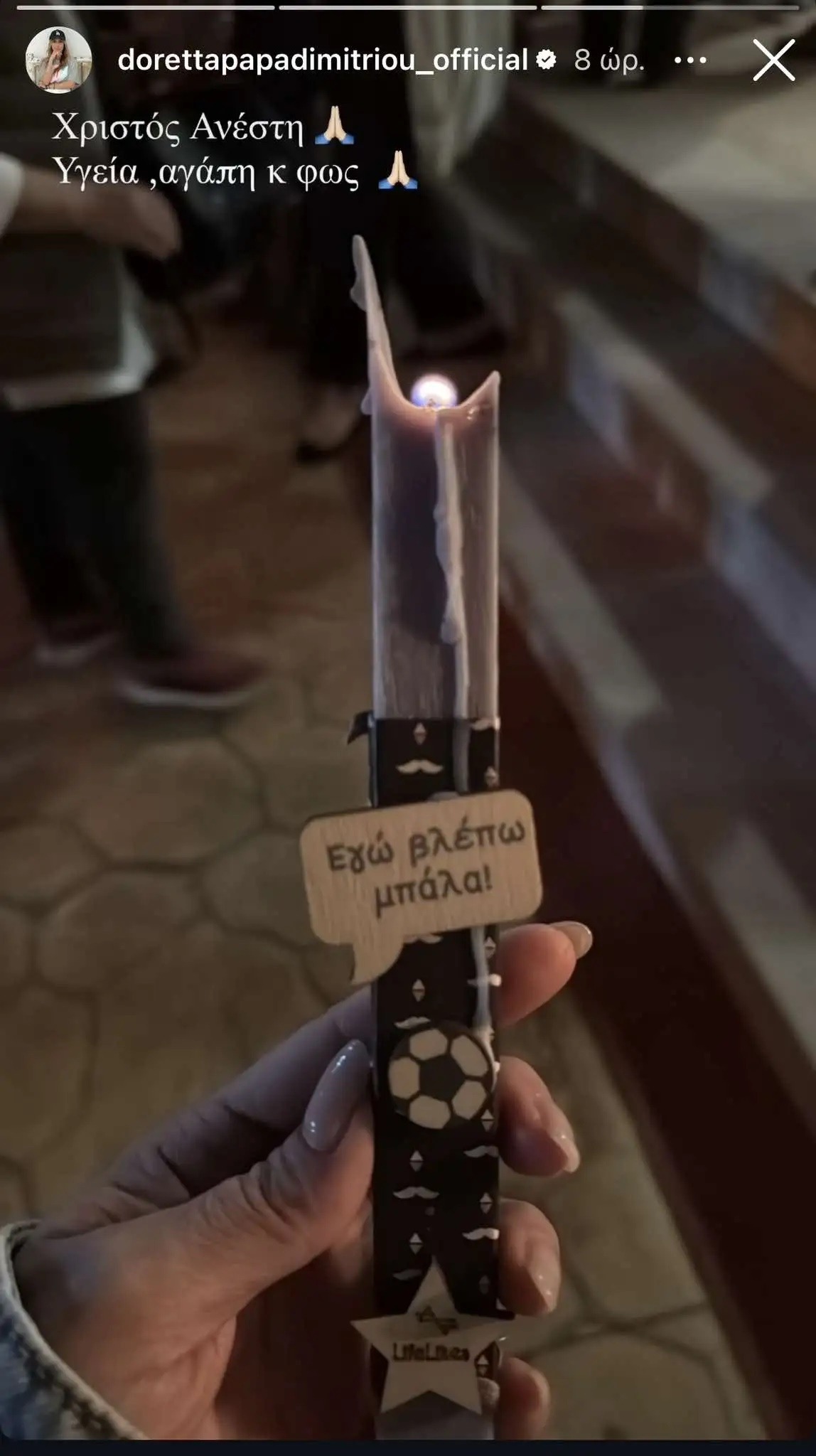 Συγκεκριμένα, η Ντορέττα Παπαδημητρίου δημοσίευσε την λαμπάδα της στην εκκλησία, που έγραφε «εγώ βλέπω μπάλα», ενώ από το ίδιο σημείο δημοσίευσε και ο Γιώργος Γεροντιδάκης με μία λαμπάδα ίδιου τύπου, που έγραφε «Εγώ Netflix».