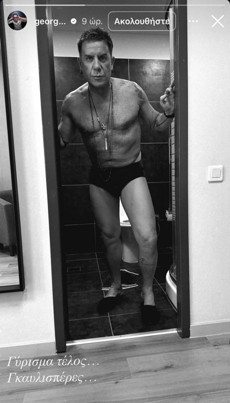 Η ασπρόμαυρη φωτογραφία μέσα από το μπάνιο του δείχνει τον Γιώργο Μαζωνάκη να φοράει μόνο το εσώρουχό του.