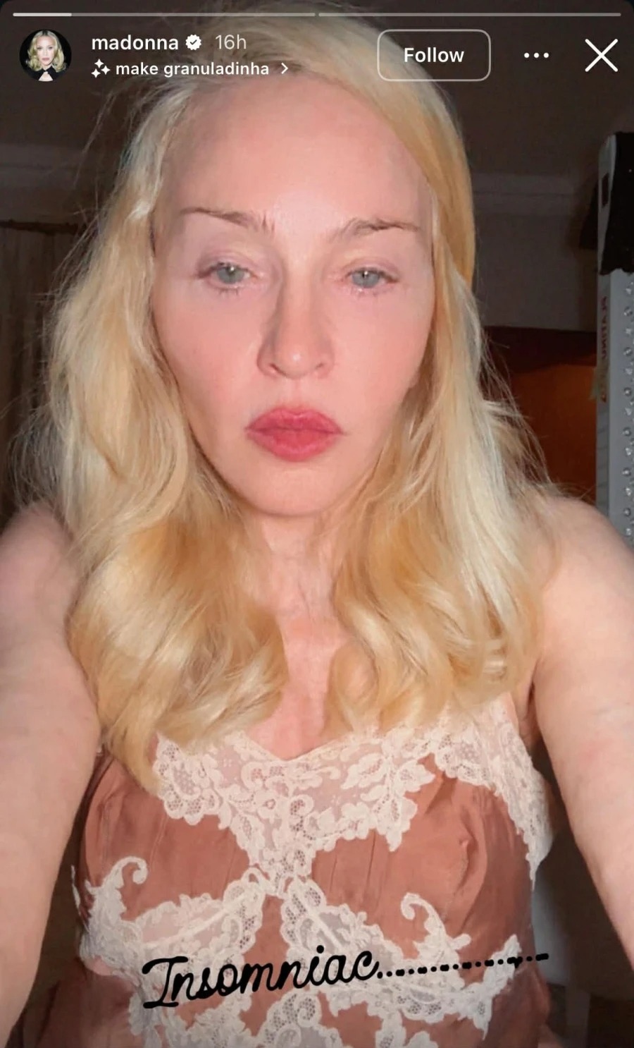 Στην φωτογραφία, η 67χρονη τραγουδίστρια φαίνεται να φοράει ένα καφέ σατέν outfit, το οποίο έχει λευκές δαντελωτές λεπτομέρειες. Στην λεζάντα της φωτογραφίας έγραψε ότι είναι «άυπνη».