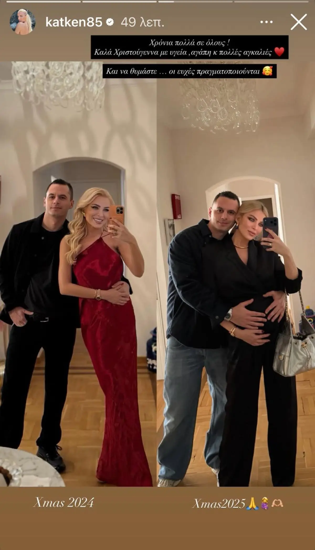 Η παρουσιάστρια στην ανάρτηση που έκανε μέσω story στον προσωπικό της λογαριασμό στο Instagram, έχει παραχωρήσει δύο φωτογραφίες, μια από τα περσινά Χριστούγεννα, και μια από τα φετινά, ενώ στη δεύτερη ο αγαπημένος της κρατά την φουσκωμένη της κοιλίτσα. «Χρόνια πολλά σε όλους! Καλά Χριστούγεννα με υγεία, αγάπη και πολλές αγκαλιές. Και να θυμάστε, οι ευχές πραγματοποιούνται» γράφει χαρακτηριστικά η παρουσιάστρια στην ανάρτησή της, στέλνοντας ένα πολύ ηχηρό μήνυμα.