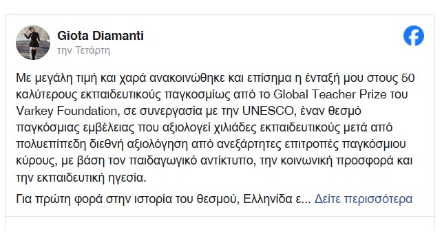 Η κ. Διαμάντη επιλέχθηκε ανάμεσα σε περισσότερες από 5.000 υποψηφιότητες εκπαιδευτικών από όλο τον κόσμο, για το έργο της στην αναζωογόνηση ενός μικρού σχολείου σε μια απομακρυσμένη κοινότητα της ορεινής Ελλάδας.