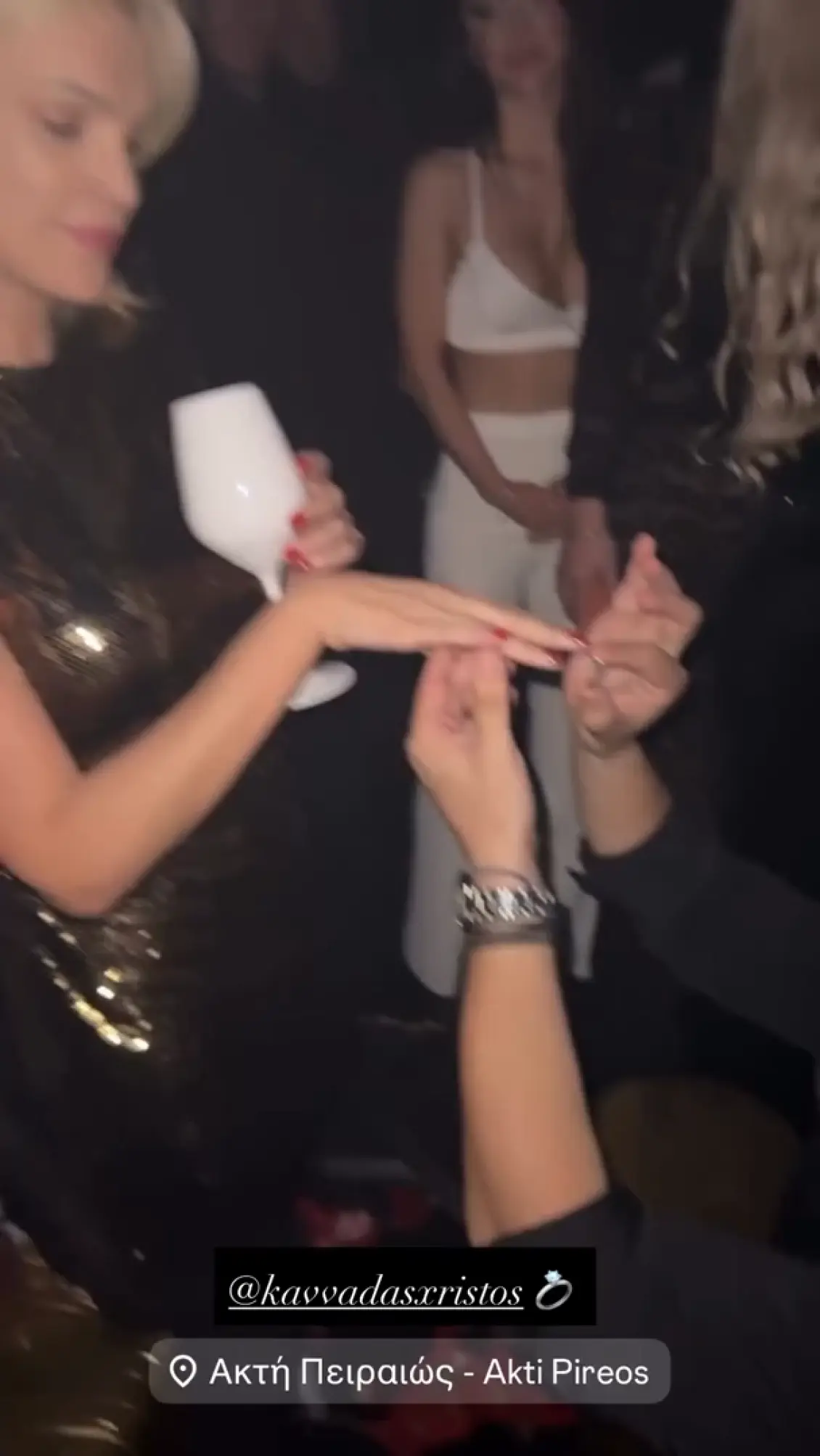 Στο βίντεο που δημοσίευσε στα social media φαίνεται η ίδια να στέκεται όρθια με τον άντρα που πιθανώς να είναι από την παρέα της να γονατίζει μπροστά της και να φορά ένα δαχτυλίδι αρραβώνων στο χέρι. Η ίδια, όταν λαμβάνει το δαχτυλίδι σκύβει και τον φιλά σταυρωτά στα μάγουλα, ενώ οι θαμώνες του μαγαζιού τους χειροκροτούν και τους εύχονται!