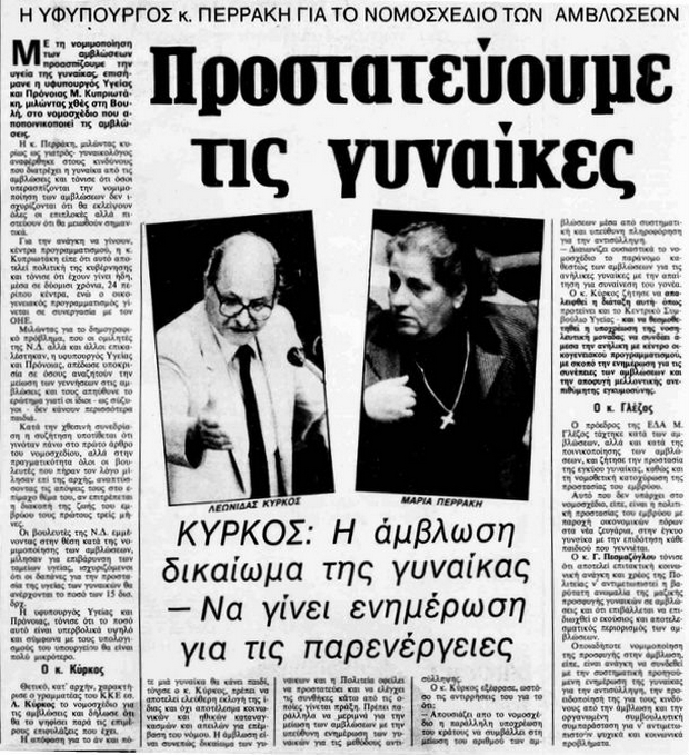 Το 1986 έφερε στη Βουλή τον νόμο για την αποποινικοποίηση. Οι αντιδράσεις ήταν σφοδρές. Πολιτικοί, Εκκλησία, ακόμη και άνθρωποι του ίδιου της του χώρου την πολέμησαν. Άκουσε βαριές κουβέντες, κατηγορίες, φόβους για «εθνικούς κινδύνους». Εκείνη όμως έμεινε σταθερή. Μιλούσε για τις γυναίκες που αιμορραγούσαν στα σπίτια τους. Για τις ζωές που χάνονταν σιωπηλά. Για το δικαίωμα κάθε γυναίκας στο σώμα της.