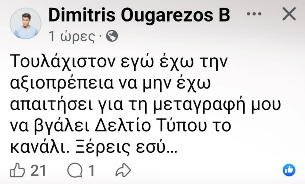 Με μια λιτή αλλά ιδιαίτερα αιχμηρή τοποθέτηση στον προσωπικό του λογαριασμό στο Facebook, ο Δημήτρης Ουγγαρέζος έστειλε το δικό του μήνυμα, «φωτογραφίζοντας» καταστάσεις που αφορούν τις τηλεοπτικές μεταγραφές. «Τουλάχιστον εγώ έχω την αξιοπρέπεια να μην έχω απαιτήσει για τη μεταγραφή μου να βγάλει Δελτίο Τύπου το κανάλι. Ξέρεις εσύ…» έγραψε χαρακτηριστικά, αφήνοντας τις ερμηνείες στους διαδικτυακούς του φίλους.