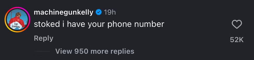 Ανάμεσα στα χιλιάδες σχόλια εμφανίστηκε και αυτό του πρώην συντρόφου της, Machine Gun Kelly, με τον οποίο χώρισε τον Νοέμβριο του 2024. Ο μουσικός, που είναι και πατέρας της 11 μηνών κόρης τους Saga Blade, έγραψε κάτω από τη φωτογραφία: «stoked i have your phone number». Το σχόλιο ήταν αρκετό για να ξεκινήσουν αμέσως οι φήμες ότι οι δυο τους ίσως τα έχουν ξαναβρεί.