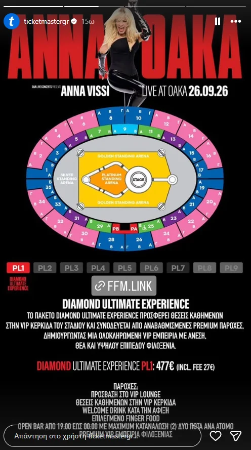 Ιδιαίτερο ενδιαφέρον συγκεντρώνει και η λεγόμενη «diamond ultimate experience», η οποία κοστολογείται στα 477 ευρώ και περιλαμβάνει VIP παροχές όπως πρόσβαση σε VIP lounge, welcome drink, open bar και αναβαθμισμένη εμπειρία φιλοξενίας για τους θεατές.