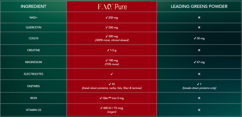 Το FAQ™ Pure επικεντρώνεται στο «τώρα». Συνδυάζοντας υψηλής συγκέντρωσης superfoods με απαραίτητους ηλεκτρολύτες, στοχεύει στα ορατά σημάδια κόπωσης και περιβαλλοντικού στρες.