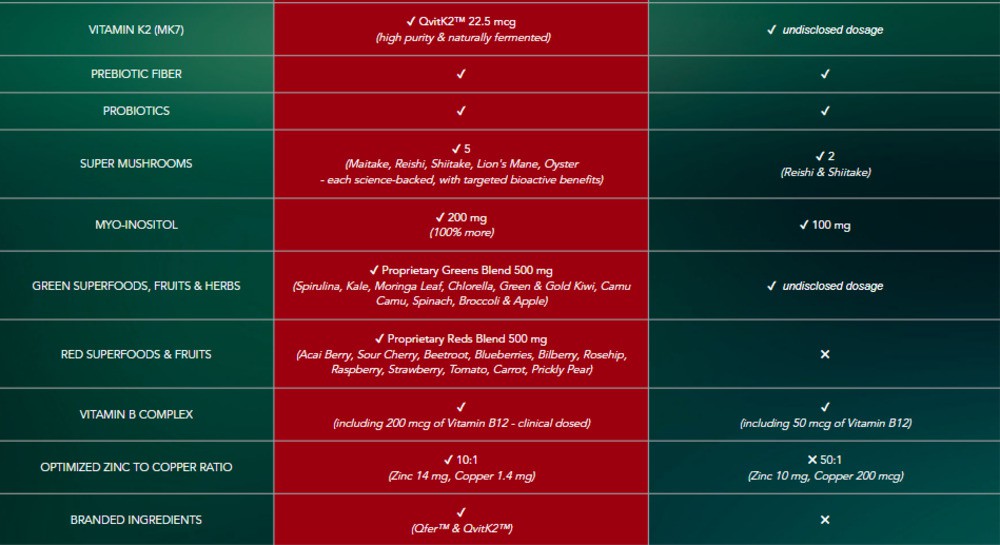 Σε σύγκριση με άλλα προϊόντα supergreens, περιέχει έως και 75% περισσότερο μαγνήσιο, ηλεκτρολύτες, κρεατίνη, 5 είδη super μανιταριών και έως 100% περισσότερη μυο-ινοσιτόλη.